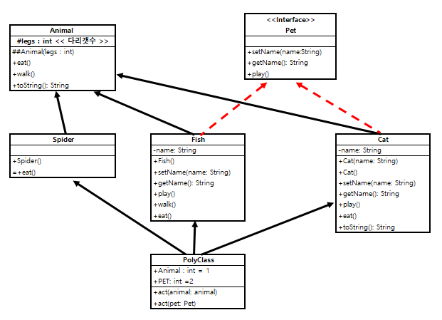 6. PolyClass의 경우, 각각의 method body는 다형성을 표현할 수 있는 1개의 메소드 호출구문으로 작성한다.