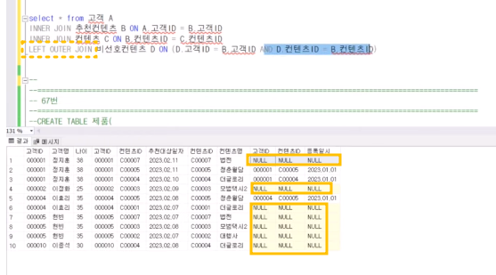- LEFT OUTER JOIN: 기준 테이블에 조인되는 값은 모두 나오지만, 맵핑이 안되면 NULL로 조회됨