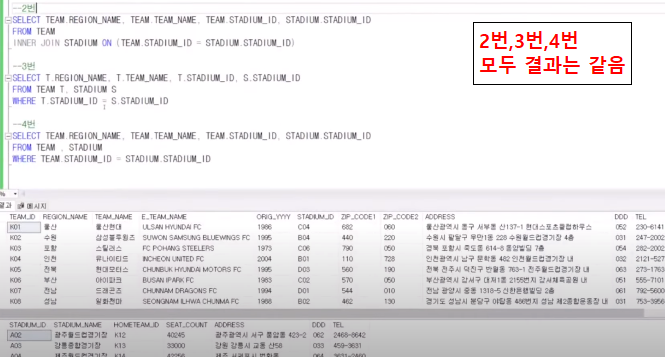 - 사용: 조회하려는 테이블 개수 - 1 개가 JOIN 테이블 갯수 여야 됨.