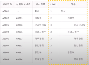 ORDER BY level; --계층구조 쿼리의 결과표현(계층형 쿼리에서만 사용됨)