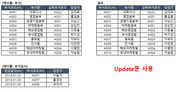 (연습10) 부서테이블 담당자 변경을 위해 SQL문을 작성하시오.