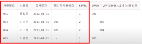 CONNECT BY PRIOR 사번 = 매니저 -- (순방향) PRIOR 자식 = 부모 순서