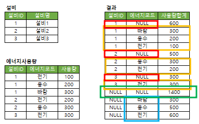group by CUBE(A.설비ID, B.에너지코드) --전체합계도 들어갈땐 CUBE사용.