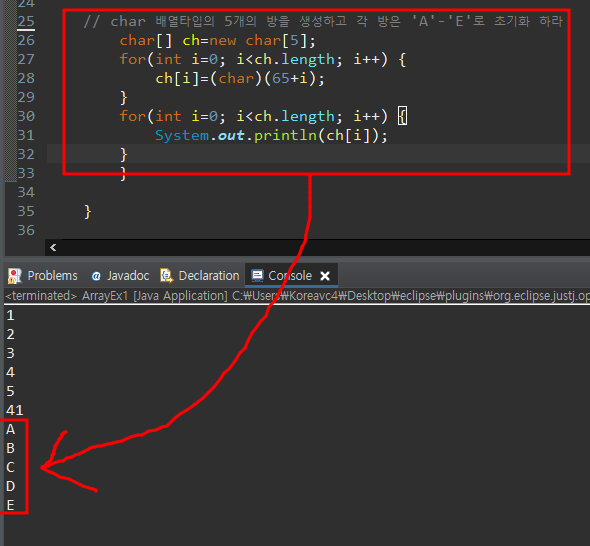 ch[i]=(char)(65+i); // 65는 아스키 코드임.