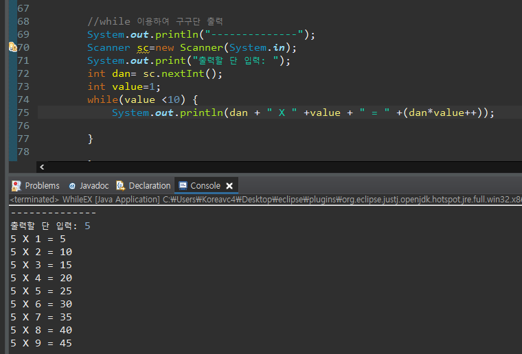 System.out.println(dan + " X " +value + " = " +(dan*value++));