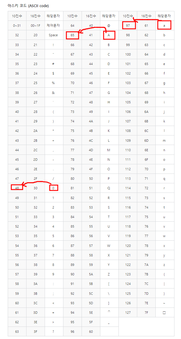 A가 65인 이유: 아스키(ASCII) 코드 암기필요.
